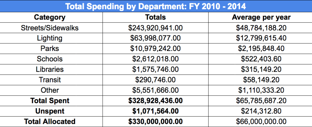 Figure 1 below illustrates the percentage spent by category from FY 2010 to 2014. About 74% of the money allocated between FY 2010 to 2014 was spent on improving streets and sidewalks and 20% on lighting projects over the course of the five fiscal years.