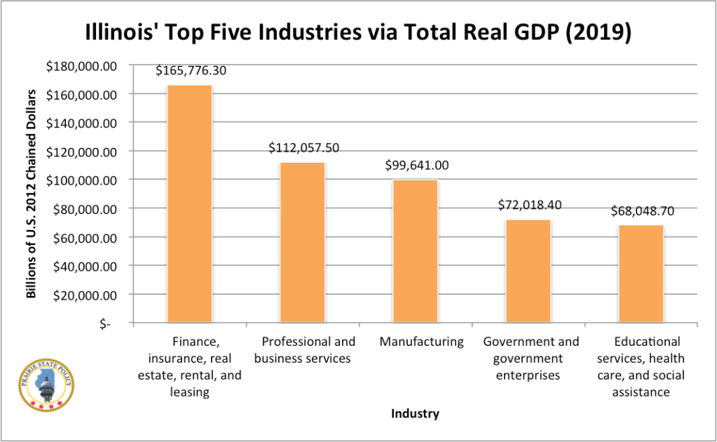 The largest industry of Illinois’ economy is the financial sector, which includes finance, insurance, real estate, rental, and leasing. This industry produced about $165 billion of economic output in 2019, nearly $53 billion more than Illinois’ second largest industry, professional services.