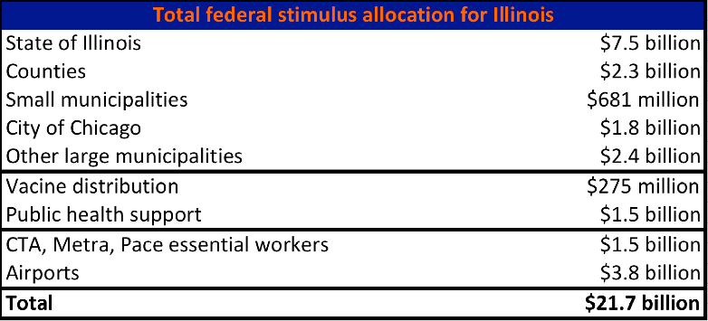 The net total being allocated to Illinois is about $21.7 billion. Figure 1 below illustrates how this money will be more narrowly allocated.